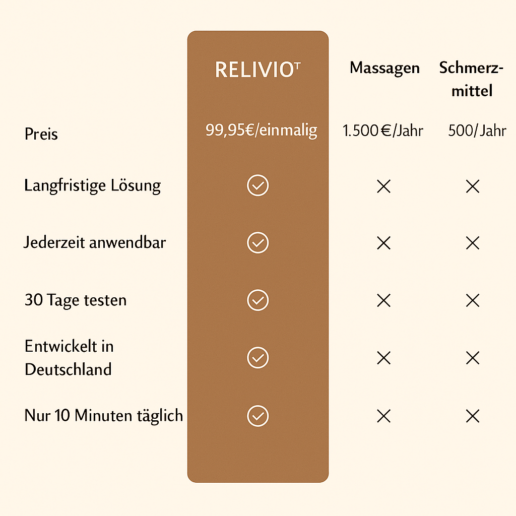 Physiotherapie & Medikamente kosten Zeit und Geld. RELIVIO™ ersetzt beides – dauerhaft.